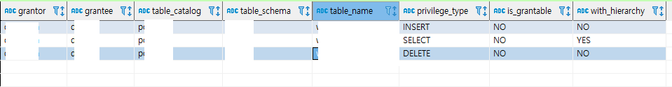 제가 권한 부여한 테이블에 대해서만 권한이 어떻게 되었는지