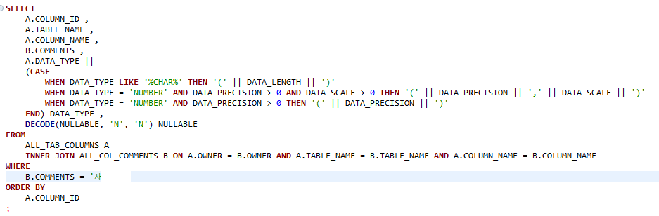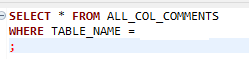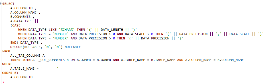 INNER JOIN ALL_COL_COMMENTS B ON A.OWNER = B.OWNER AND A.TABLE_NAME = B.TABLE_NAME AND A.COLUMN_NAME = B.COLUMN_NAME