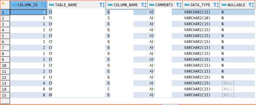 그러면 해당 설명으로 설정한 모든 테이블의 컬럼 정보를 가져오게 됩니다.