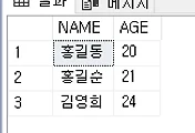 CREATE TABLE CURSOR_TEST ( NAME VARCHAR(20), AGE INT ) ; INSERT INTO CURSOR_TEST(NAME,AGE)VALUES('홍길동',20); INSERT INTO CURSOR_TEST(NAME,AGE)VALUES('홍길순',21); INSERT INTO CURSOR_TEST(NAME,AGE)VALUES('김영희',24); INSERT INTO CURSOR_TEST(NAME,AGE)VALUES('김철수',22); INSERT INTO CURSOR_TEST(NAME,AGE)VALUES('이세계',19); INSERT INTO CURSOR_TEST(NAME,AGE)VALUES('박나래',25);